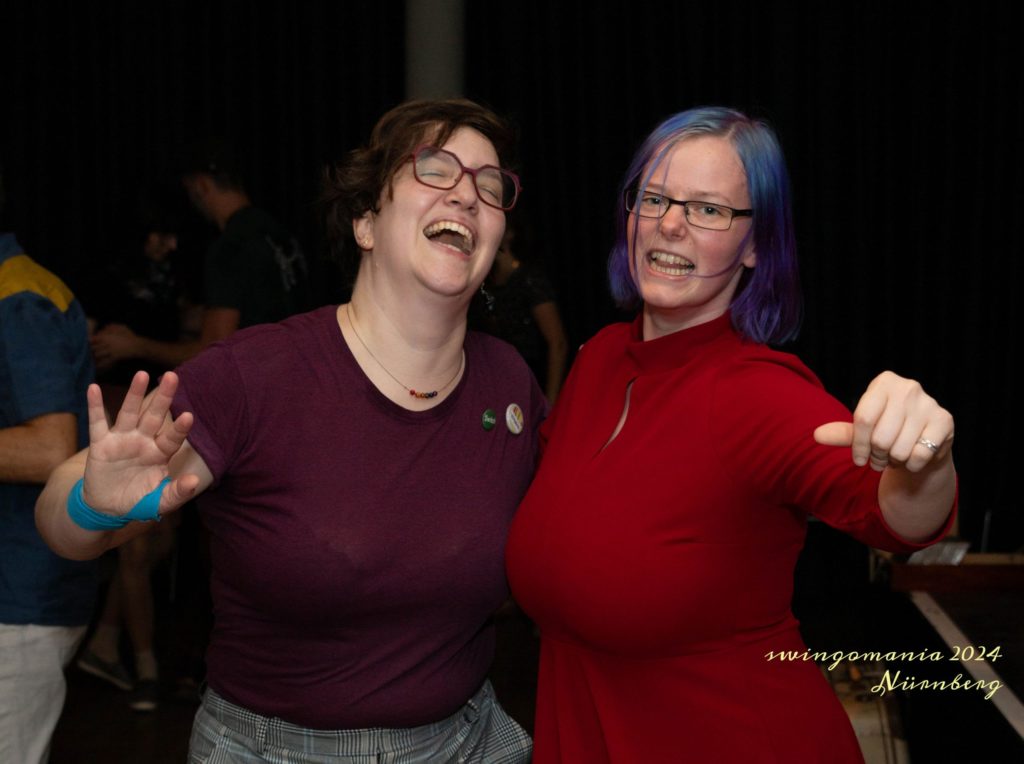 Stacy (rechts) über sich: I started dancing Lindy Hop in the rainy city of Vancouver, Canada about a decade ago. The sound of jazz spoke to me from the moment I stepped on the dance floor for the first time and I never looked back! In 2020 I moved from Canada to Germany where I have been teaching and dancing ever since.